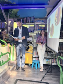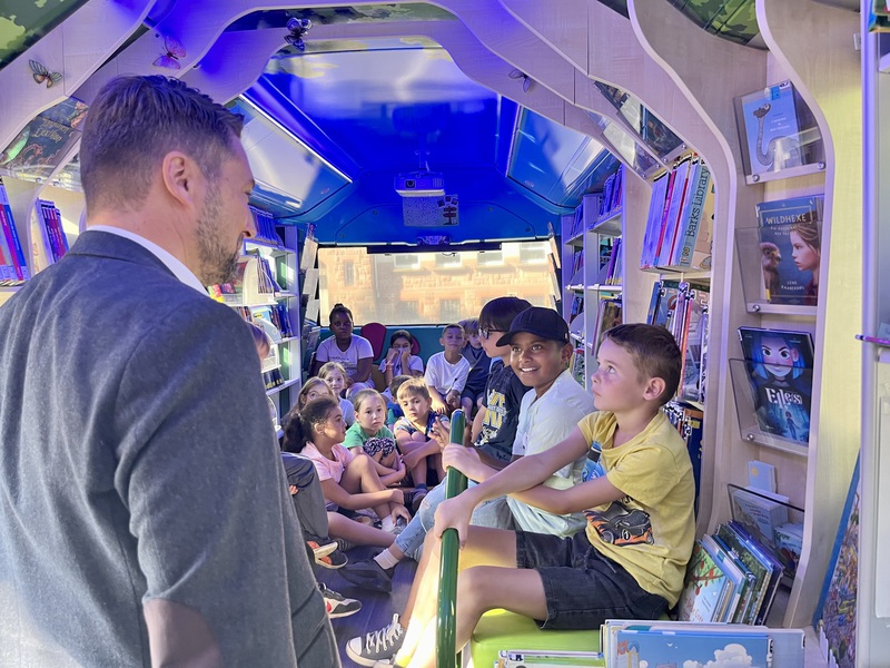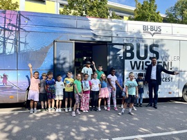 Am 3. September 2024 durfte ein Großteil der Kinder der Fuchsklasse 2.2 zum ersten Mal Bücher und Medien im BI-BUS der Stadtbibliothek Saarbrücken ausleihen. Anlässlich des Jubiläums "50 Jahre Gebietsreform" besuchte auch Oberbürgermeiser Uwe Conradt den BI-BUS und las den Kindern das Bilderbuch "Eddie und der neugierige Baum" von Stephan Lomb vor.