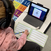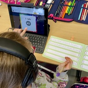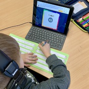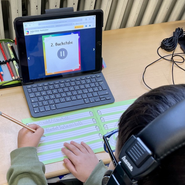 Einige Kinder der Fuchsklasse haben ihre ersten Tablet-Diktate geschrieben. Wählen konnten sie zwischen Buchstaben-, Wörter- oder Satzdiktaten. In Ebooks sind entsprechende Audiodateien für die Kinder eingebaut. Sie können sich alles so oft und so lange anhören wie nötig. Die gehörten Buchstaben, Wörter oder Sätze schreiben sie in ihr Schreibheft.