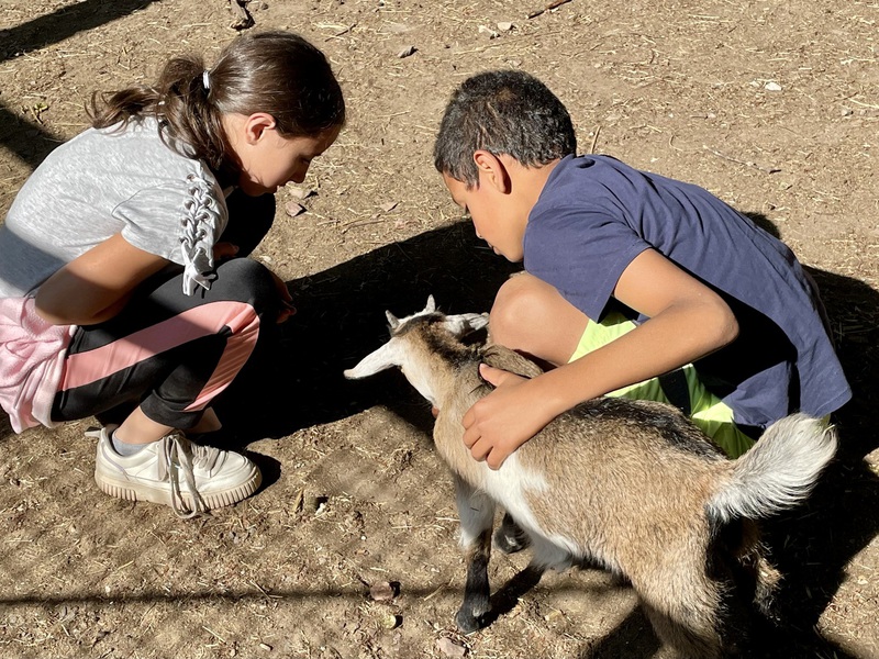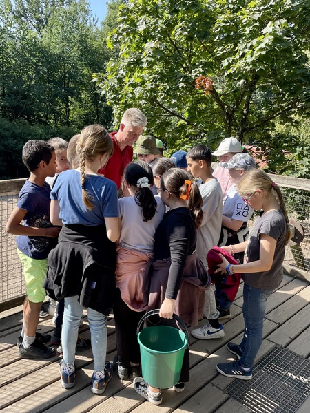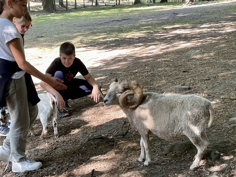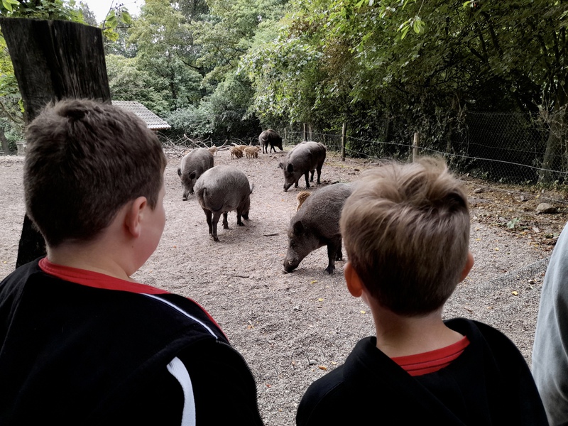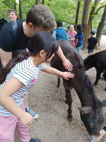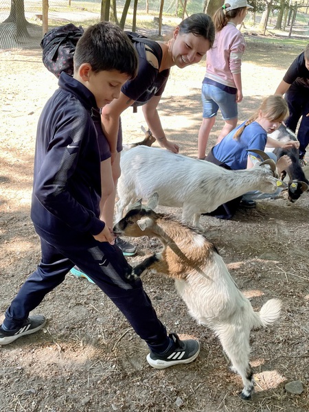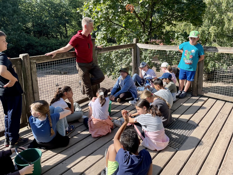 Seit Juni besuchen alle Klassen der Turmschule für jeweils 3 Tage den Wildpark in Saarbrücken. Immer zwei Klassen gemeinsam lernen mit Myriam Hill und Adrian Höber von der Wildpark Akademie viel über die Tiere im Wildpark. Die Kinder dürfen zu den Tieren in die Gehege gehen und Kontakt mit ihnen aufnehmen, sie streicheln und füttern. Im Waldklassenzimmer frühstücken die Kinder zusammen und danach spielen und toben sie gestärkt im Wald. In verschiedenen Übungen nehmen sie den Wald mit allen Sinnen wahr oder erleben die Natur.